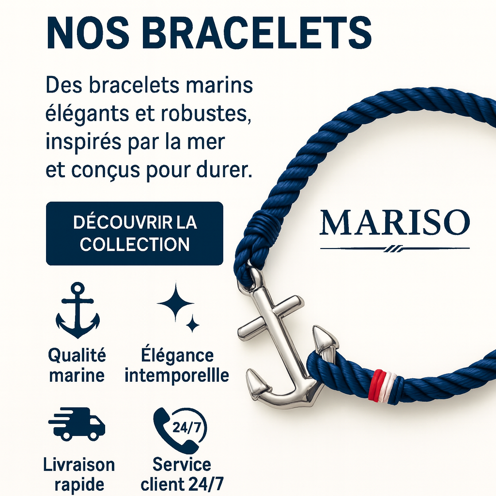 Née de la passion pour la mer, la pêche et l’art du détail, MARISO crée des bracelets uniques qui évoquent la liberté, le voyage et l’élégance. Chaque pièce est soigneusement façonnée à la main à partir de cordage marin, héritage authentique du monde de la voile et de la pêche.